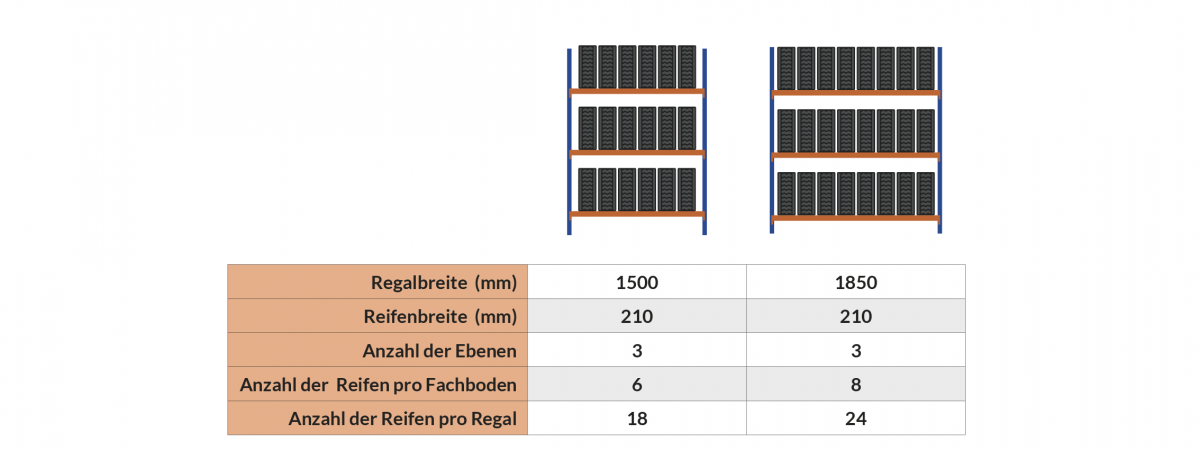 Um eine Lagerung von Reifen in unterschiedlichen Größen zu ermöglichen, können Sie die Fachböden des Picking-Reifenregals in 50- mm-Abständen verstellen.